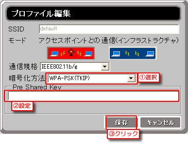 WPA-PSK(TKIP)… WPA-PSKモードでTKIP暗号化を行います。