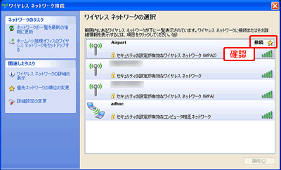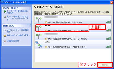 [ワイヤレス ネットワークの選択]画面が表示されますので接続先を選択して、[接続]ボタンをクリックします。