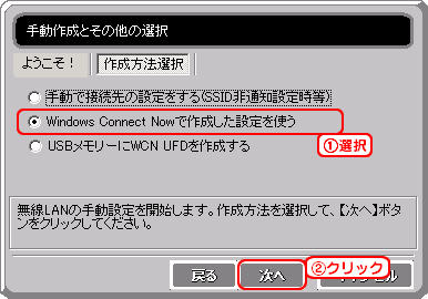 [Windows Connect Nowで作成した設定を使う]を選択し、[次へ]ボタンをクリックします。