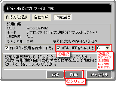 [WCN UFDを作成する]にチェックが入っていることを確認し、パソコンに挿入したUSBメモリーのドライブ名を選択して、[作成]ボタンをクリックします。
