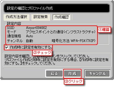 設定内容を確認し、[作成時に設定を有効にする]にチェックを付けて、[作成]ボタンをクリックします。