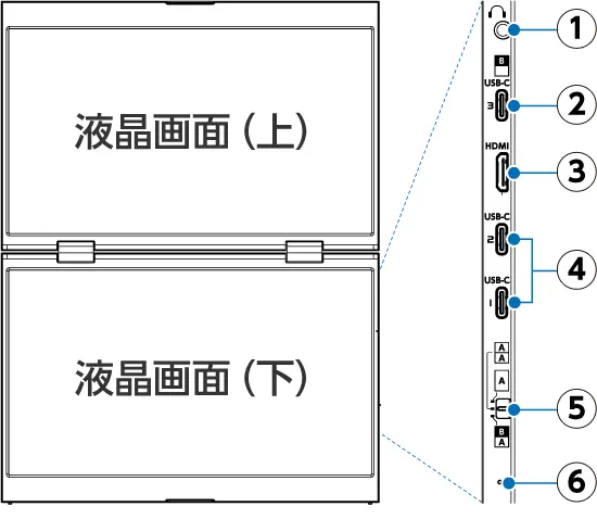 ※ HDMI(miniHDMI)端子を使う場合、USB Power Delivery 対応充電器(15W 以上給電可能なもの)とケーブルを別途用意し、USB-C 1、2 端子のいずれかにつなぐ必要があります。