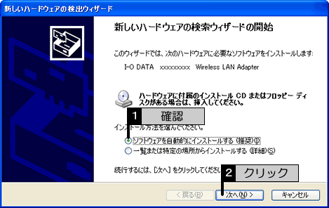 本製品装着後、下の画面が表示されますので、[ソフトウェアを自動的にインストールする]が選択されていることを確認して、[次へ]ボタンをクリックします。