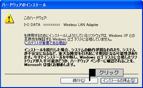 弊社製ソフトウェアが確認された時点で、マイクロソフトが認証するソフトウェアでは無いというメッセージが表示されますが、特に問題ありませんのでそのまま続行します。