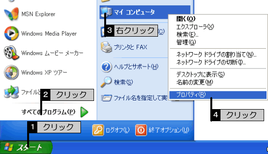 [スタート]をクリックし、[マイコンピュータ]を右クリックして、[プロパティ]をクリックします。