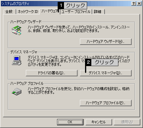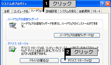 [ハードウェア]タブをクリックして、[デバイスマネージャ]ボタンをクリックします。