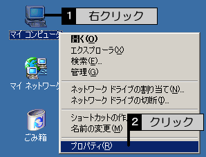 [マイコンピュータ]アイコンを右クリックして、[プロパティ]をクリックします。