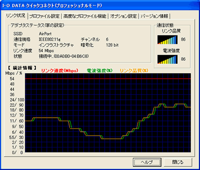 過去3分(初期設定時)の通信状況をグラフ化して表示します。 通信状況を取得する間隔は[オプション設定]で変更できます。 緑:電波強度、黄:リンク品質、赤:リンク速度