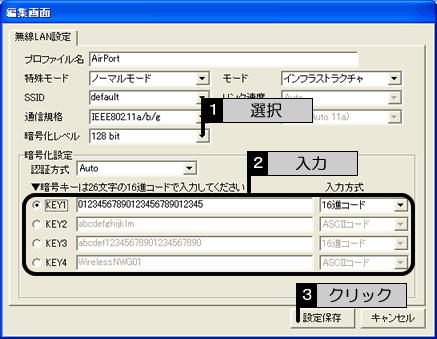 本製品を含むWNシリーズでは、暗号キーとして16進コードやASCIIコードでの暗号キー入力方式を採用していますが、他社製品には、文字列から16進コードへ変換する際、本製品と変換方式の異なる製品があります。