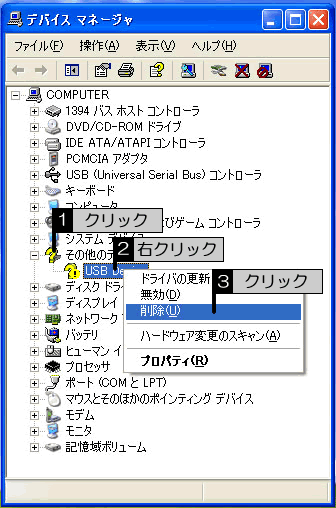 Bデバイスマネージャの[その他のデバイス]をダブルクリックし、表示された[USB Device]をクリックし選択してから右クリックし、表示されたメニューから[削除]をクリックしてください。