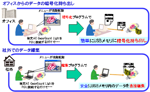 これらの問題を解決すべく開発された「秘文AE CG Light」は、USBメモリでOffice文書を利用する際に、暗号化をして保存することにより、USBメモリの紛失による情報漏洩を防止致します。さらに、「秘文AE CG Light」により、USBメモリ内に保存した暗号化ファイルは、USBメモリ上にのみ保存するよう制御しているため、社外PCなどにコピーされることはありません。よって社外PCからのウィルスなどによる情報漏洩を防止します。本製品はソフトウェアのインストールは不要で、USBメモリをPCに接続するだけですぐにご利用になれます。