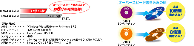 BD-R 10倍速書き込み対応だから、ハイビジョン映像などの大容量データもスピードバックアップ!25GBのデータを、わずか11分台で書き込めます。書き込み完了まで、長時間待つ必要がないため、快適にお使いいただけます。