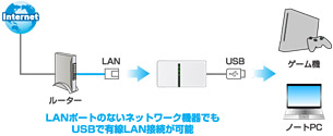 LANポートがないWiiやノートPCなどの場合、有線LANによるネットワーク接続はできません。しかし本製品を使えばUSB接続によりLANポートを増設、有線LANによる安定したネットワーク接続が可能となります。