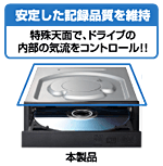 メディアの高速回転時に内部で発生する気流をバランス良くコントロールし、メディアの反りを防ぐことで書き込みの安定性を向上させる「フラッタリデューサー」設計。より安定した書き込みを実現しました。