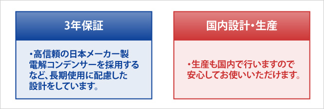 設計から生産まで日本国内で行い、信頼性の高い日本メーカー製電解コンデンサを採用、温度上昇と電力消費を抑えて故障の要因となる冷却ファンを不要とするなど長期使用に配慮しています。