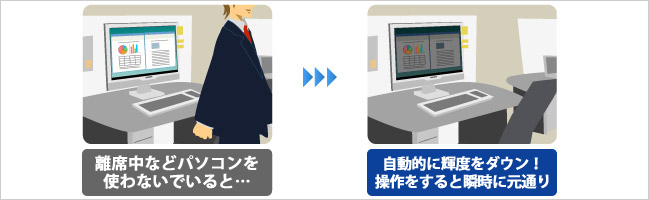 節電アプリ「エコ番人」なら、液晶ディスプレイの消費電力に影響する一番大きな要素「輝度」を自動的にコントロール。パソコンを使っていないときは自動的に輝度をダウン。マウスを動かしたり、キーボードからの入力を行うと自動的に元の状態に復元します。特に意識せずに節電することができます。