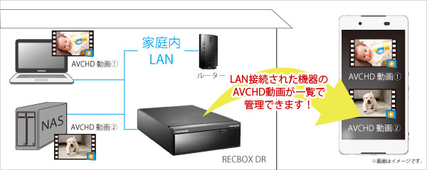 他のAVCHDの配信に対応したDLNA対応NASやメディアサーバー機能を有効にしているパソコンなどでAVCHDコンテンツを公開設定にしておけば、RECBOX DRのデジタルラック機能を使って、宅外からでも、リモート接続が可能です。