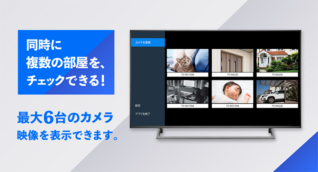 「QwatchTV」は、ネットワークカメラの映像をテレビで視聴することができるアプリケーションです。寝室や玄関先など映像を確認したいところに設置したネットワークカメラの映像をテレビでリアルタイムに確認できます。
