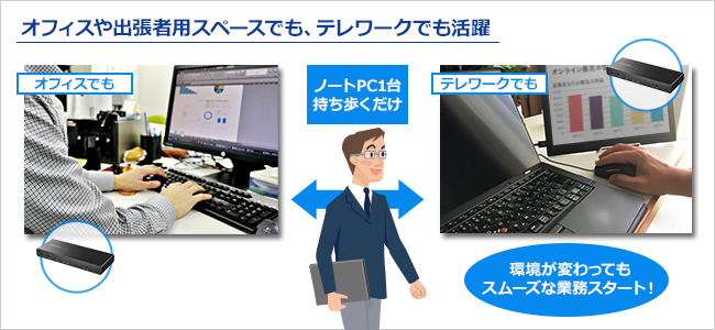 オフィスでの利用はもちろんのこと、テレワークによる在宅での業務やフリースペースでの業務でも活躍します。