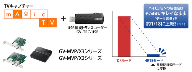 USB接続タイプのトランスコーダー「GV-TRC/USB」(別売)と本製品を組み合わせれば、「mAgicTV GT」で録画した番組を画質変換させたり、最大でデータ容量を約18分の1(※1)に圧縮することができるようになります。