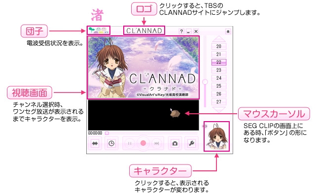 「SEG CLIP」(セグクリップ)CLANNADモデルは、TBSアニメーション「CLANNAD」(クラナド)のキャラクターがアプリケーション画面に登場するワンセグチューナーです。パソコンのUSB端子に接続すれば、お持ちのパソコンでワンセグ放送を見たり録ったりすることができます。さらにCLANNADオリジナルコースターやクリアカードなどの特典付き!パッケージやCDレーベルにまでこだわった、ファンならひとつは持っておきたいグッズです。
