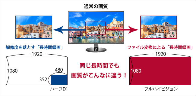 「MPEG2-TS」形式のデジタル放送を、低ビットレートにしても画質を維持できる「MPEG4-AVC/H.264」形式のファイルへと変換することで、解像度は落とさずにフルハイビジョンの高画質のまま最大15倍も長い録画が可能になります。