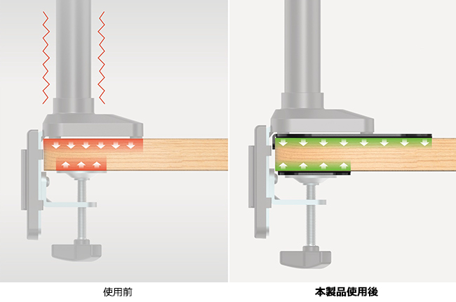 ディスプレイアームを机に取り付ける際に発生する、取り付け部のひずみやたわみを軽減。机への負担が軽減します。