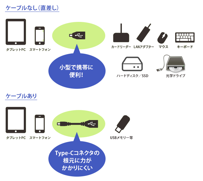 携帯性を重視するなら小型のケーブルなし(直差し)タイプ、USBメモリーの場合にはType-Cコネクターへの力がかかりにくいケーブルありをお勧めいたします。