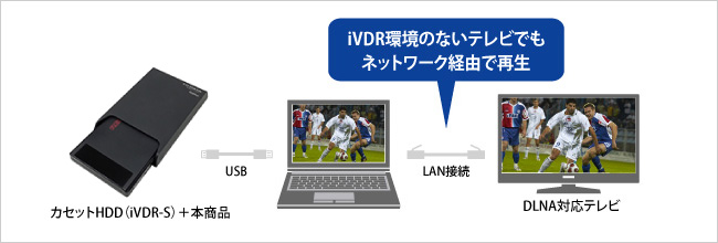 ノートパソコンの画面が狭く、大画面で楽しみたい場合に、DLNA対応テレビ(※1)やメディアプレーヤー(※1)でカセットHDD(iVDR-S)のハイビジョンコンテンツを楽しめます。