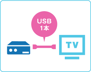 テレビ本体とハードディスクをUSBケーブルでつないだら、接続完了。