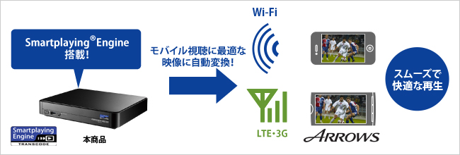 通信速度にあわせて映像のサイズを変換し、最適な環境で視聴できる「Smartplaying® Engine」(トランスコード)を搭載。Wi-Fiやモバイル回線といった通信環境を意識することなく、いつでも映像をスムーズに楽しむことができます。