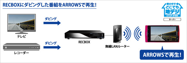 RECBOXに保存した番組を富士通のスマートフォン「ARROWSシリーズ」で観ることができます。スマートフォンなら手軽にどこへでも持ち歩くことができるので、お風呂やキッチン、寝室など家の中の好きな場所で録画番組を楽しめます。