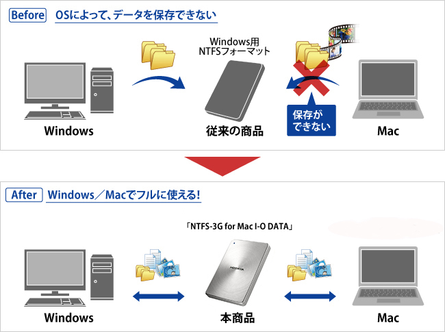 ソフトウェア「NTFS-3G for Mac I-O DATA 」をMacにインストールすることで、Mac OS X(※1)でも、NTFSフォーマットのまま、データの書き込みができるようになります。また、Mac専用フォーマットへ変更しないので、WindowsとMacの両方で使用できます。