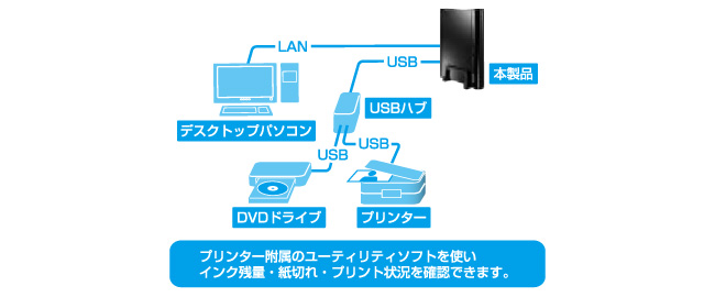 ネットワーク経由でUSB機器を共有できる機能「net.USB」を搭載。プリンターやハードディスク、DVDドライブなどのUSB機器をネットワークに接続し、USBハブ