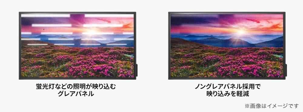 高輝度440cd/㎡(パネル輝度500cd/㎡)を実現。明るい教室や会議室でも見やすい、非光沢(ノングレア)パネルを採用。蛍光灯や日光の反射による見えづらさを軽減しています。