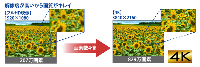 最近のデジカメは1000万画素以上が多く、パソコンの画面では縮小して見ている場合があります。そんな高画質な写真を4K対応液晶ディスプレイで表示すれば829万画素での出力が可能なので、今まで撮った写真を高画質で楽しむことができます。フルHDの4倍の解像度ならではの高精細な映像で、これまで表現が難しかったディテールを思う存分お楽しみいただけます。