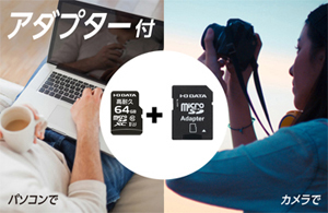 添付のSDカード変換アダプターを使用することで、SDカードに早変わり。デジタルカメラ、ビデオカメラ、デジタルオーディオなどで活用できます。特に、フルHDや4Kなど高画質動画を大量に撮影する際や、高音質の音楽ファイルをたっぷり保存する際などにオススメです。