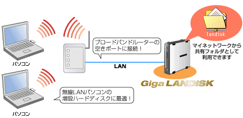 - 無線ブロードバンドルーターや無線アクセスポイントを併用すれば、ケーブルレスでGiga LAN DISKを使うことが可能です。
