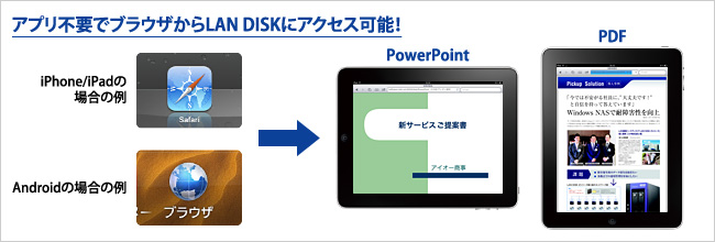 LAN DISKの指定フォルダをクラウドストレージサービスと同期させることができます。社内・家庭内でLAN DISKに保存しておいたファイルを、外出先でもスマートフォンから閲覧したりPC上にファイルを持ち出して編集することが可能。LAN DISKの電源OFF時もファイルにアクセスすることができます。