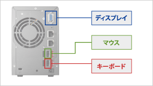 本体背面のVGAコネクターおよび、USBポートにそれぞれディスプレイとUSBキーボード・マウスなどを接続することで、各種の設定が可能です。ネットワークに接続する前や、ネットワークの障害などでリモートデスクトップ接続が利用できない場合に有効な設定方法です。