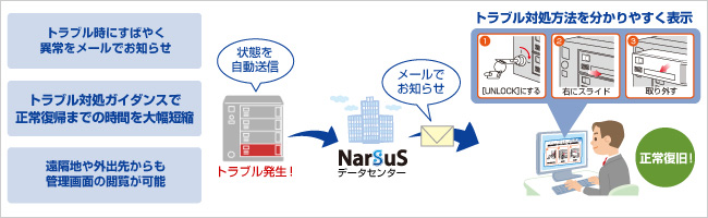 お客様に代わってNASの状態をネットワーク経由で監視するクラウド管理サービス「NarSuS(ナーサス)」を無償提供。設置場所を問わず複数台のNASを一括管理できるので、管理者の負担を大幅に削減できます。