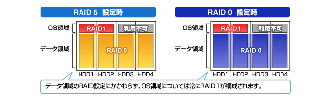万が一の事態にもシステムの安全な運用が可能なよう、ハードディスクのOS領域とデータ保存領域が別々のパーティションに分かれています。また、OS領域についてはデータ領域のRAID設定にかかわらずRAID 1が設定され、冗長性が確保されています。