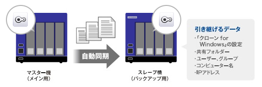 リレーNASとは本商品を2台(プライマリー/セカンダリー)用意し、プライマリーが故障した場合はセカンダリーを昇格させることで、ダウンタイムを最小限に抑えるバックアップ構成です。データはもちろん設定情報も同期するため、ユーザーに与える影響だけでなく、復旧にかかわる工数も大幅に減らすことが可能です。