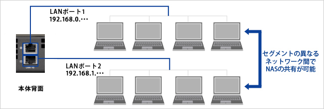 本商品は、2つの1GbEと1つの10GbE用LANポートを搭載しているので、セグメントの異なるネットワークの間で共有利用することが可能です。
