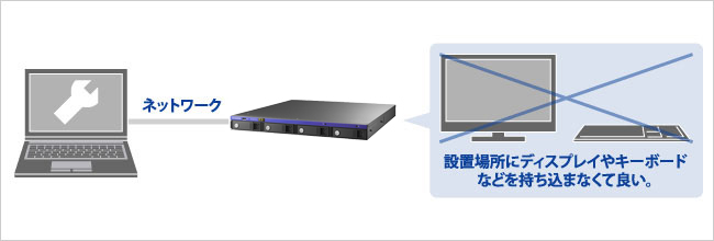 本体を直接操作することなく、ネットワークを経由して遠隔操作を行うことが可能です(リモートデスクトップ接続)。設置場所に液晶ディスプレイやキーボードなどの入力機器を設置する必要がなく、管理者が自席から対象機を操作することができるので便利です。