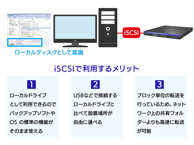iSCSIターゲット機能により、本商品上に作成した仮想ディスク(VHDX)をiSCSIストレージとして提供することができます。