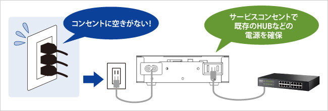 電源コンセントの空きが確保できなくても設置できるように、本体にサービスコンセントを一口搭載しています。既存のスイッチングハブなどの電源を本商品から確保することができます。