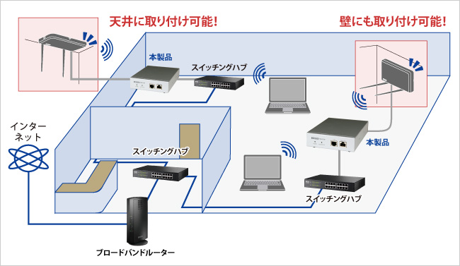 従来、無線LANアクセスポイントの設置にはLANケーブルと電源の配線が必要でしたが、本商品の導入により、最大100mまでのLANケーブル一本で電源も供給することができます。天井や壁掛け設置する際に電源工事の必要が無く、低コストでオフィスに無線LANアクセスポイントを設置することができます。