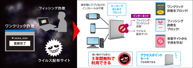 「WN-DAX5400QR」は、安全にインターネットをご利用いただけるよう、ワンクリック・フィッシング詐欺やウィルス配布サイトをブロックする「ネットフィルタリング」機能を搭載しています。ルーター側でまとめて設定すれば、スマホやパソコン、ゲーム機などの通信端末側でのアプリのインストールなど一切不要なので、どんな端末にもフィルタリングを適用できます。(APモードでもご利用いただけます)