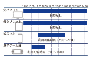 例えば、お子様がオンラインゲームやYouTubeなどの動画サイトを閲覧できる時間は平日18時~20時まで…といったルールを「WN-DX1300GRN」内で設定することができます。